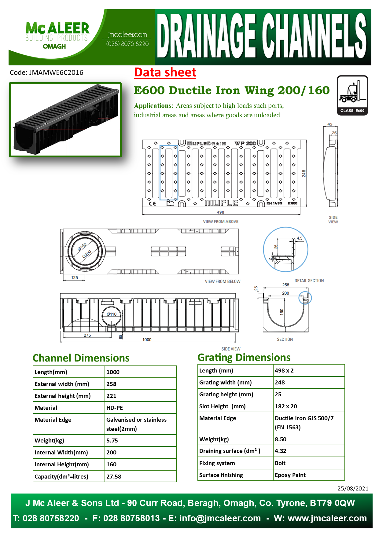 Complete Per M 200W x 160D 1m PVC Base Glv Steel Edge 2 E600 DI Grates & Locking Bolt Kit